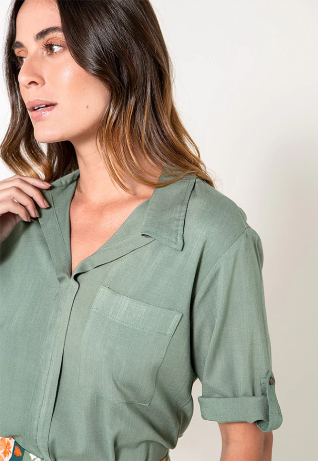 A camisa possui modelagem reta fluída, bolso na altura do busto e mangas 3/4.Composição: 98% viscose e 2% elastano.Ref:003709