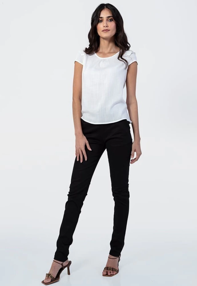A blusa possui modelagem solta e levemente acinturada, com drapeado leve na gola e manga curta com babado.Composição: 97% algodão e 3% elastano.Ref:003710
