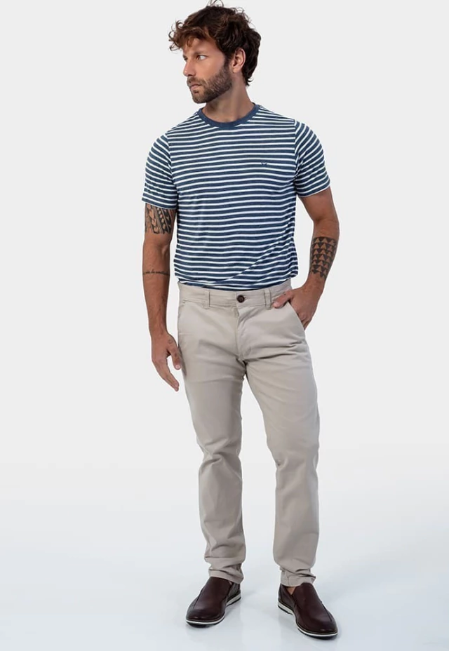 A calça confeccionada em tecido 98% algodão e 2% elastano, possui modelagem reta, cós reto com passante e fechamento por botão e zíper, bolsos diagonais na parte frontal e bolsos posteriores.Composição: 98% algodão e 2% elastano.