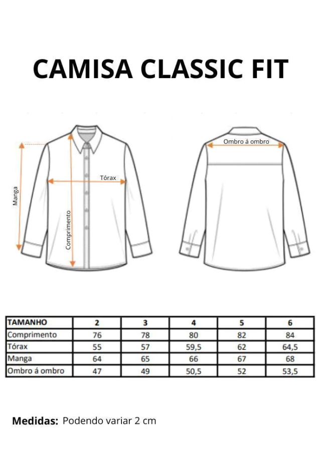 A Camisa é confeccionada em tecido 100% algodão fio a fio, possui modelagem tradicional, colarinho clássico, mangas longas com abotoamento único no punho e na carcela, fechamento frontal por botões, detalhe frontal de logo bordada, barra arredondada. Composição: 100% algodão