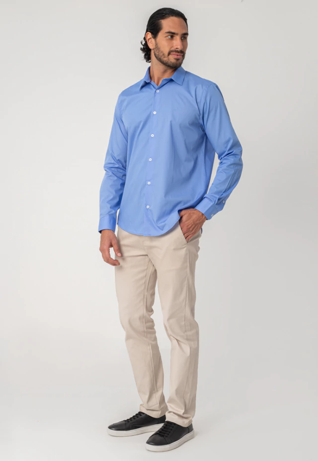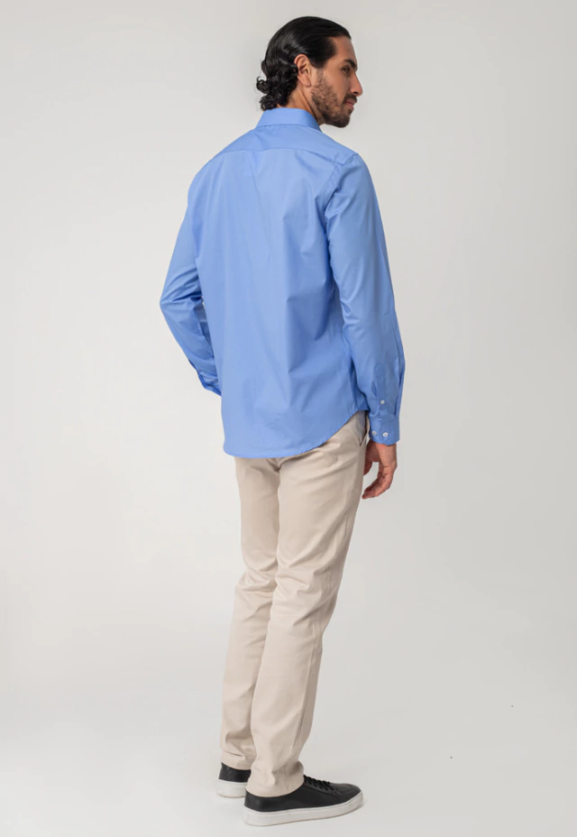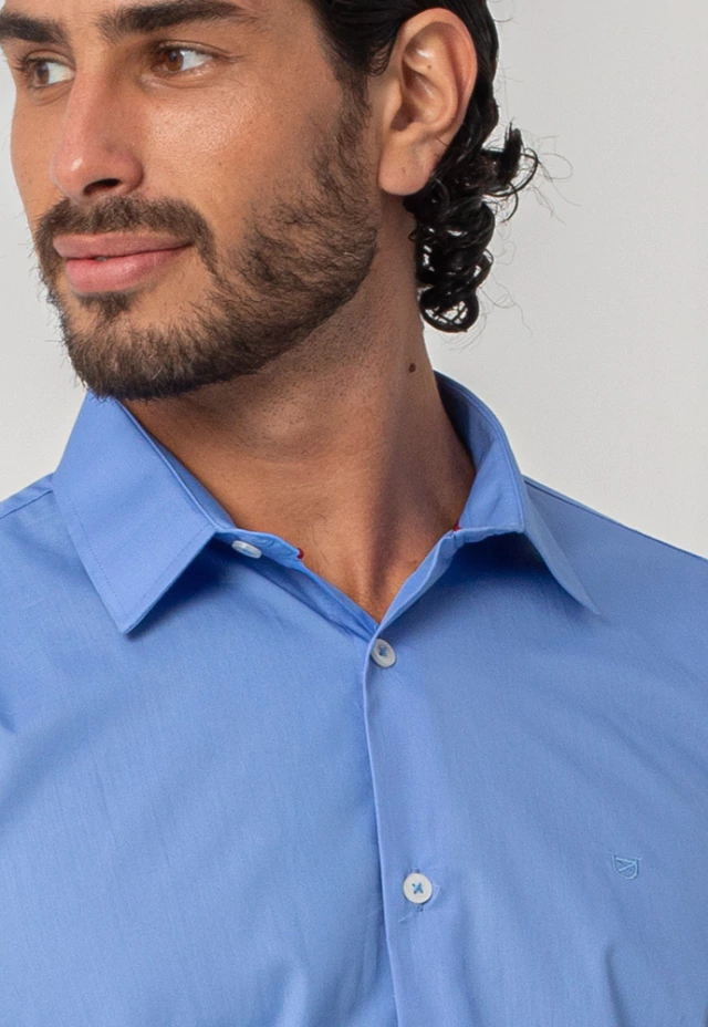 A Camisa é confeccionada em tecido 100% algodão fio a fio, possui modelagem tradicional, colarinho clássico, mangas longas com abotoamento único no punho e na carcela, fechamento frontal por botões, detalhe frontal de logo bordada, barra arredondada. Composição: 100% algodão