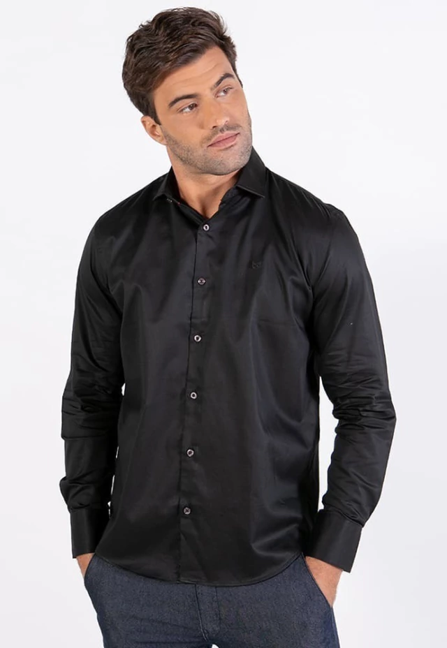 A Camisa é confeccionada em tecido 100% algodão fio a fio, possui modelagem tradicional, colarinho clássico, mangas longas com abotoamento único no punho e na carcela, fechamento frontal por botões, detalhe frontal de logo bordada, barra arredondada. Composição: 100% algodão