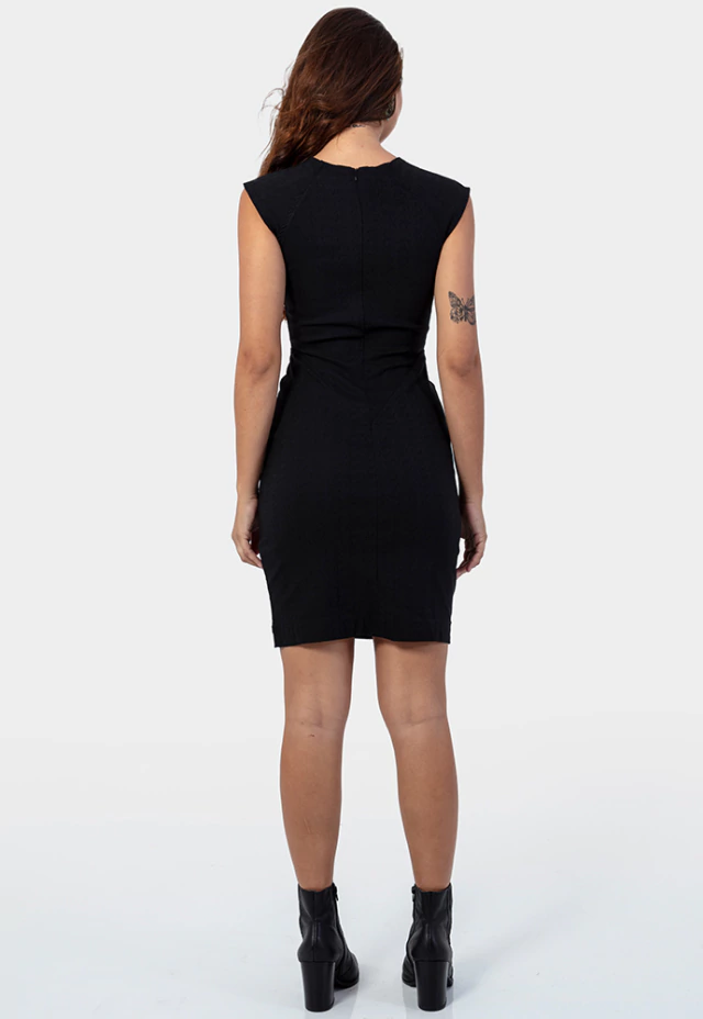 O vestido é confeccionado em tecido 78% viscose, 18% poliuretano e 4% elastano, com padronagem lisa, possui modelagem reta, levemente justa e acinturada, com decote alto e manga mais largas. Além de pences frontais e fechamento posterior por zíper invisível no meio das costas.Composição: 78% viscose, 18% Poliamida e 4% elastano.